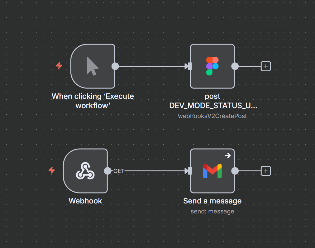 L’objectif est de configurer un webhook, qui envoie un signal à N8N lorsqu’un fichier est passé en “ready for dev”. N8N reçoit alors le nom du fichier et son identifiant et il est possible de générer un mail indiquant à une liste de personne prédéfinie que le fichier est prêt à être revu par les parties prenantes. Cela permet de fluidifier le workflow en automatisant une tâche répétitive.