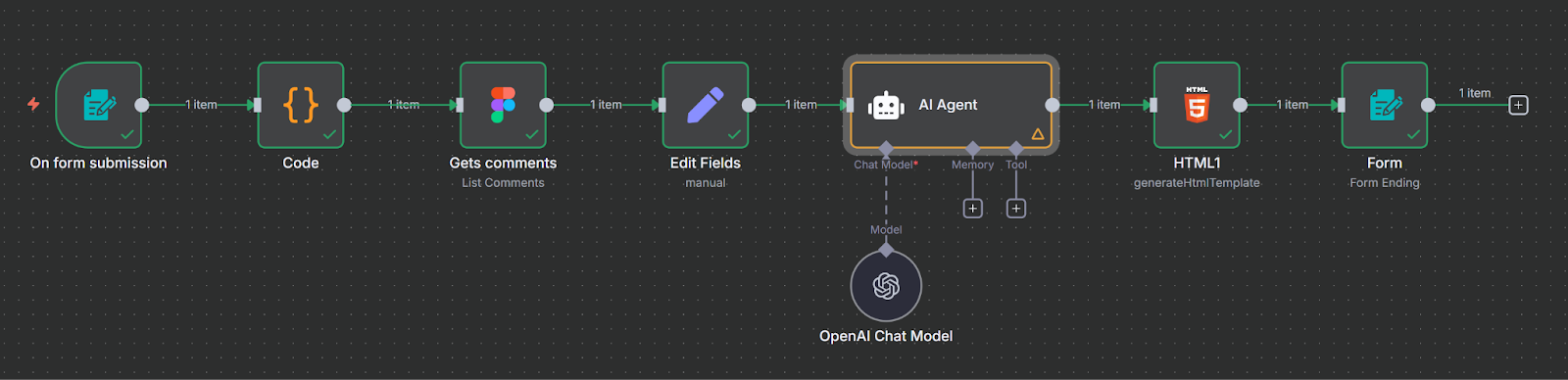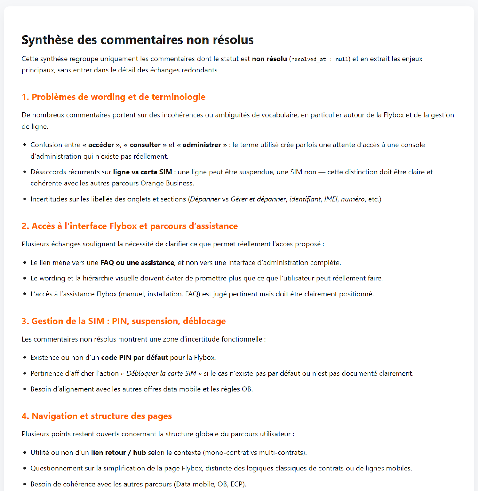 Exemple de workflow pour résumer intelligemment les commentaires d'une maquette via l'IA.