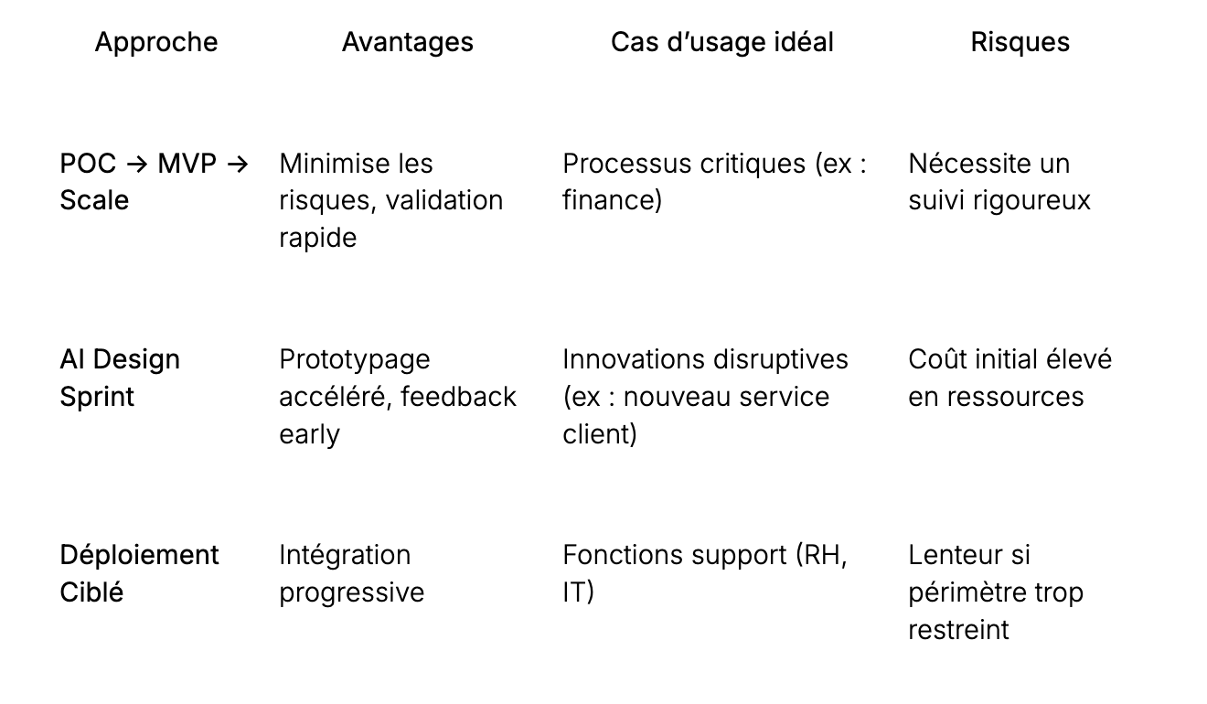 Une stratégie bien pensée permet de limiter les risques, d’optimiser les ressources et de maximiser l’adoption par les équipes. Selon la nature des processus visés, leur criticité et la maturité technologique de l’entreprise, plusieurs approches sont possibles : du déploiement progressif à l’intégration ciblée, en passant par le prototypage rapide.